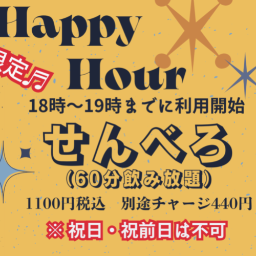 工作日晚上7点前开始使用!60分钟无限畅饮(需额外支付440日元)*12月至1月4日期间不提供Senbero服务。